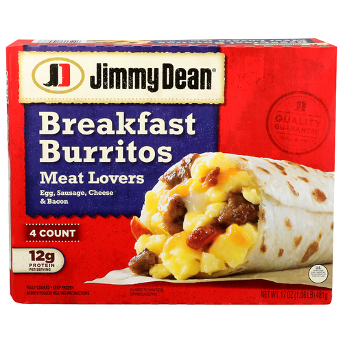 Energize your morning with Jimmy Dean Meat Lovers Breakfast Burritos. Featuring real eggs, sausage, cheese and bacon rolled into a soft flour tortilla, these frozen fully cooked breakfast burritos are the ultimate grab-and-go breakfast. With 12 grams of protein per serving, our burritos are a tasty microwavable breakfast option for your busy mornings. For a delicious breakfast at home or on the go, microwave and serve. Includes one 17 oz package of 4 meat lovers breakfast burritos. Jimmy Dean once said, "Sausage is a great deal like life. You get out of it what you put in." Which pretty much sums up his magic formula for having a great day. Today, the Jimmy Dean Brand team brings you many ways to add some sunshine to your morning.