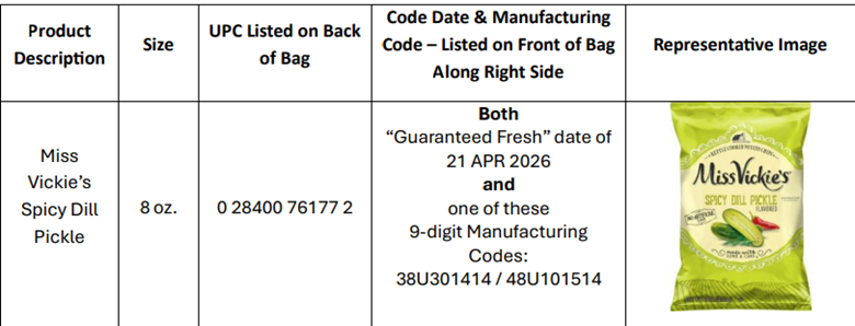 Frito-Lay is initiating a voluntary recall of a limited number of 8 oz. bags of Miss Vickie’s Spicy Dill Pickle Potato Chips because they could include jalapeño-flavored potato chips and therefore may contain undeclared milk ingredients.